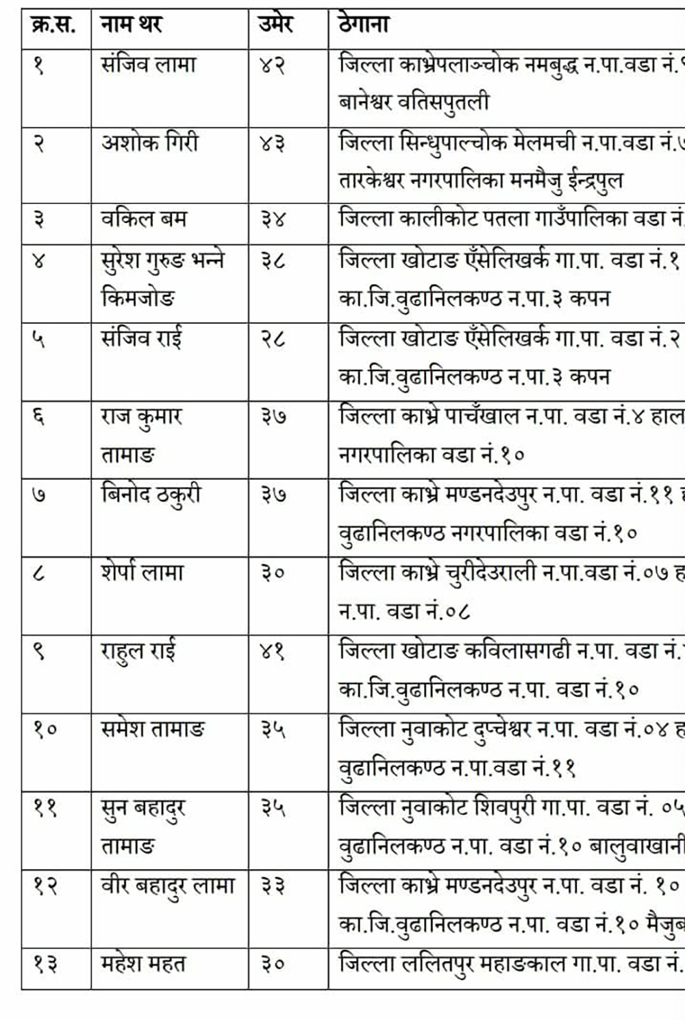 काठमाडौँ । काठमाडौँमा प्रहरीले विभिन्न क्षेत्रमा रहेर गुण्डागर्दी गर्ने १८ जनालाई पक्राउ गरेको छ । शुक्रबार राति भएको अपरेसनमा जिल्ला प्रहरी परिसर काठमाडौँको टोलीले ५ र उपत्यका अपराध अनुसन्धान कार्यालयले १३ जनालाई समातेको हो । काठमाडौँको सार्वजनिक जनजीवन सुरक्षित र भयरहित बनाउने नीतिअनुसार थप अरु पनि पक्राउ पर्नसक्ने जिल्ला प्रहरी काठमाडौँका प्रमुख एसएसपी रमेश थापाले बताए । प्रहरीका अनुसार, डिम्पल भनिने प्रविण तामाङलाई पक्राउ गरिएको छ । उनी श्याम लामा समूहमा सक्रिय रहेर बौद्द एरियामा गुण्डागर्दीमा संलग्न रहेको पाइएको छ । यस्तै, प्रहरीले कलंकी–बाफल एसियाबाट बिर्जु महर्जनलाई पक्राउ गरेको छ । उनी त्यहाँ गुण्डागर्दीमा संलग्न रहेको प्रहरीको भनाइ छ । यस्तै, प्रहरीले कलंकी बस टिकट काउन्टर र पेट्रोल पम्प आसपास क्षेत्रमा गुण्डागर्दीमा सक्रिय सुजन कार्कीलाई पनि पक्राउ गरेको छ । प्रहरीले स्यूचाटार एरियामा गुण्डागर्दीमा सक्रिय सरु गुरागाई पनि नियन्त्रणमा लिएको छ । यस्तै, बौद्धमा लुटपाट तथा गुण्डागर्दीमा संलग्न रहेको आरोपमा विकि लामालाई पनि पक्राउ गरेको जनाएको छ । यस्तै, काठमाडौँ उपत्यका अपराध अनुसन्धान कार्यालय टेकुले थप १३ जनालाई काठमाडौँका विभिन्न स्थानबाट पक्राउ गरेको छ ।