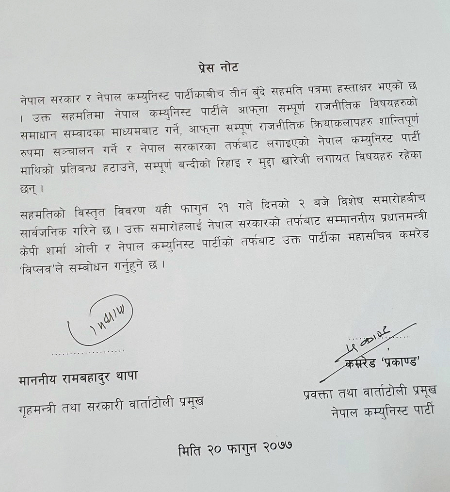 काठमाडौं । वर्तमान सरकारले प्रतिबन्धित गराएको विप्लव नेतृत्वको नेकपासँग सरकारले गरेको वार्ता सफल भएको छ । प्रधानमन्त्री केपी शर्मा ओली र नेत्रविक्रम चन्द विप्लवले एउटै मञ्चबाट संयुक्त सम्बोधन गर्ने भएका छन् । फागुन २१ गते दिउँसो २ बजे विशेष समारोहलाई प्रधानमन्त्री ओली र नेकपा महासचिव विप्लवले सम्बोधन गर्न लागेका हुन् । सरकारी वार्ता टोलीका सदस्य राजन भट्टराईका अनुसार राष्ट्रिय सभागृहमा विशेष समारोह आयोजना हुने छ । सोही समारोहबाट सहमतिको विस्तृत विवरण सार्वजनिक गरिने छ । बिहीबारको वार्तापछि सरकारी वार्ता टोलीका संयोजक एवम् गृहमन्त्री रामबहादुर थापा ‘बादल’ र विप्लव समूहको वार्ता टोली संयोजक एवम् प्रवक्ता खड्कबहादुर विश्वकर्माले हस्ताक्षर गरेको संयुक्त प्रेस नोट सार्वजनिक भएको छ । प्रेस नोटमा सरकार र विप्लव समूहबीच तीन बुँदे सहमति पत्रमा हस्ताक्षर भएको उल्लेख छ । विप्लव नेतृत्वको नेकपाले आफ्ना सम्पूर्ण राजनीतिक क्रियाकलापहरु शान्तिपूर्ण रुपमा सन्चालन गर्ने उल्लेख छ । साथै सरकारले विप्लव समूहमाथि लगाएको प्रतिबन्ध हटाउने सहमति पनि भएको छ । हत्या हिंसामा लागेको भन्दै सरकारले विप्लव समूहमाथि २८ फागुन २०७५ मा प्रतिबन्ध लगाएको थियो ।