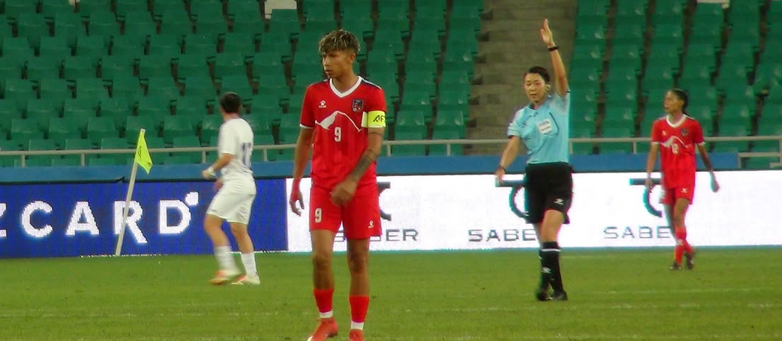 काठमाडौं । टाइब्रेकरमा उज्बेकिस्तानसँग पराजित हुँदै नेपाली राष्ट्रिय महिला फुटबल टोली एएफसी एसियन कप छनोट चरणबाटै बाहिरिएको छ। निर्धारित समयमा ३–३ गोलको बराबरी भएपछि खेलको निर्णय टाइब्रेकरबाट लिइएको थियो। टाइब्रेकरमा नेपाल उज्बेकिस्तानसँग ४–२ ले पराजित हुँदै समूह चरणबाटै बाहिरिएको हो। नेपालका लागि गीता राना, सविता रानामगरको प्रहार सफल भए पनि कप्तान सावित्रा भण्डारी साम्बा र गोलरक्षक अञ्जना राना मगरले गोल गर्न सकेनन्। त्योसँगै नेपालविरुद्ध जित हात पारेको उज्बेकिस्तान सन् २०२६ मा हुने महिला एसियन कपमा छनोट भएको छ। पहिलो हाफमा ३–१ ले पछि परेको नेपालले दोस्रो हाफमा २ गोल थप्दै खेललाई बराबरीमा ल्याएको थियो। निर्धारित समयमा ३–३ को बराबरी भएपछि खेलको निर्णय टाइब्रेकरबाट भएको हो। खेलको ७१ औँ मिनेटमा कप्तान सावित्राले व्यक्तिगत दोस्रो गोल गर्दै नेपाललाई ३–२ को अवस्थामा ल्याइन्। त्यसको दुई मिनेटमा नै साम्बाले ह्याट्रिक पूरा गर्दा नेपाल ३–३ को स्थितिमा आएको थियो। त्यसअघि खेलको दोस्रो मिनेटमा नै १–० ले अग्रता बनाएको उज्बेकिस्तानले ११औँ मिनेटमा अग्रता दोब्बर पारेको थियो। उज्बेकिस्तानले नेपालको आत्मघाती गोलमा अग्रता दोब्बर पारेको थियो। उज्बेकिस्तानकी कप्तानको प्रहार नेपालकी गोलरक्षक अञ्जनालाई बिट गर्दै अघि बढेको बल डिफेन्डर समीक्षा घिमिरेलाई लाग्दै गोलमा परिणत भएको थियो। खेलको १६औँ मिनेटमा नेपालकी कप्तान सावित्रा भण्डारी साम्बाको पासमा रश्मी कुमारी घिसिङको प्रहार सिधै उज्बेकिस्तानकी गोलरक्षकको हातमा पुग्यो। सुरुवातदेखि नै दबाबमा परेको नेपालका लागि खेलको २४औँ मिनेटमा साम्बाले गोल गरिन्। उज्बेकिस्तानका डिफेन्डरलाई छक्याउँदै डिबक्स बाहिरबाट साम्बाले गरेको सशक्त प्रहारले सिधै पोष्टको जाली चुमेको थियो। खेलको ३८औँ मिनेटमा उज्बेकिस्तानले पेनाल्टी गोलमा नेपालविरुद्ध अग्रता फराकिलो पारेको थियो। डिबक्सभित्र नेपालकी डिफेन्डर सरस्वती हमालको ह्यान्ड भएपछि उज्बेकिस्तानले पेनाल्टी मौका पाएको थियो। पहिलो हाफको इन्ज्युरी समयमा उज्बेकिस्तानकी इग्रासेभाले साम्बामाथि खराब ट्याकल गरेपछि रेफ्रीले दोहोरो पहेँलो कार्ड देखाएका थिए।रातो कार्ड पाएपछि उनी मैदानबाट बाहिरिँदा उज्बेकिस्तान १० खेलाडीमा सीमित बनेको थियो।