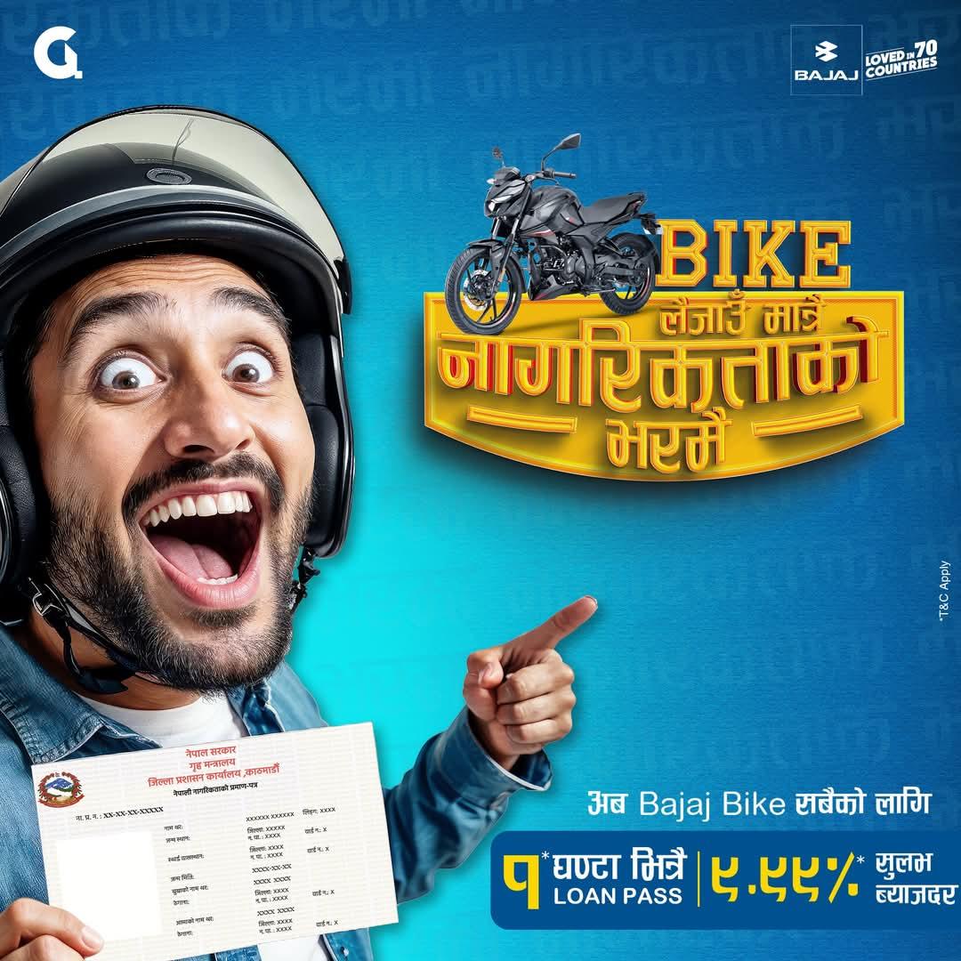 काठमाडौं । बजाज मोटरसाइकलको नेपालको लागि एक मात्र आधिकारिक बिक्रेता हंसराज हुलासचन्द एण्ड को प्रा लि ले अब बजाजका मोटरसाइकल नागरिकताको आधारमा मात्रै सरल फाइनान्स मार्फत खरिद गर्न सकिने स्कीम लिएर आएको छ । मोटरसाइकल खरिद गर्दा हुने झन्झटिलो फाइनान्स प्रकृयालाइ अझ सरल होस भनि आफ्ना ग्राहकहरुको लागि यो स्कीम ल्याएको कम्पनीले जनाएको छ । यसअघि मोटरसाइकल खरिद गर्दा घर जग्गाको लालपुर्जा, पानी वा बिजुलीको बिल,आफ्नो आयस्रोतको सर्टिफिकेट लगायतका विभिन्न कागजात आवश्यकता पर्दथ्यो । यी झन्भटहरुलाइ हटाएर अब भने बजाजका ग्राहकहरुले यी कागजातको सट्टामा नागरिकता मात्रै लगेर सहजै बजाजका मोटरसाइकल फाइनान्स मार्फत किन्न सक्नेछन् । किस्ताबन्दीमा किन्न चाहने ग्राहकले १ घण्टा भित्रै लोन पास गरेर ९.९९ प्रतिशत प्रतिशत सुलभ ब्याजदरमै सरल फाइनान्स मार्फत यो सुविधा पाउन सक्नेछन् । यो स्कीम बजाजका देशभरका आधिकारिक शोरुमहरुमा उपलब्ध सबै मोडलहरुमा लागू हुने कम्पनीले जानकारि दिएको छ ।