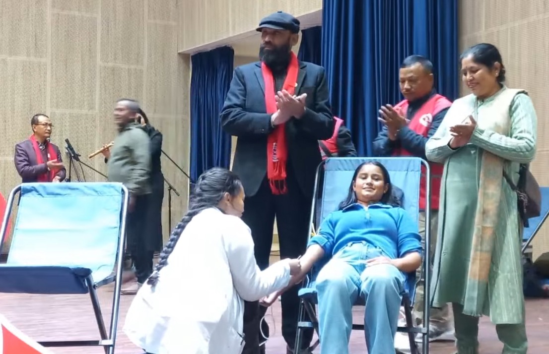 काठमाडौं । प्रेमपूर्ण सानुमैञा असहाय सेवा कोषको सहयोग एवं इभेण्ट सोलुशनको व्यवस्थापनमा नेपाल स्वयंसेवी रक्तदाता समाज काठमाडौं महानगर समितिद्वारा ‘सांगीतिक माहोलमा गरौं रक्तदान !’ यो बिशेष आह्वानका साथ भिक्षु कोण्डन्य महास्थविरज्यूको प्रमुख आतिथ्यतामा रक्तदान एवं रक्तदान जागरण गीतहरूको ऐतिहासिक सामूहिक लोकार्पण कार्यक्रम एक समारोह बीच स्थानीय नेपाल पुलिस क्लबको सभाकक्षमा आयोजना गरि सम्पन्न भएको छ । नेपाल स्वयंसेवी रक्तदाता समाजका केन्द्रीय अध्यक्ष एवं सर्वाधिक स्वयंसेवी शतक रक्तदाता प्रेमसागर कर्माचार्यको भावनात्मक शब्द रचना र मनराजा नकर्मीद्वारा कर्णप्रिय संगीत सृजना गरिएको छ वटा गीतहरूलाई सामूहिक रूपमा लोकार्पण गरियो । जसमा प्रमुख अतिथि भिक्षु कोण्डन्य महास्थविर, बिशेष अतिथि प्रेमपूर्ण सानुमैया असहाय सेवा कोषकी संरक्षक,सानुमैञा कर्माचार्य,अतिथिहरू क्रमश ः भिक्षु नागित,भिक्षु सुध्दिको,भिक्षु बुध्ददत्त र श्रद्धाचारी गुरूमाँ रहनु भएको थियो । कार्यक्रमका प्रमुख अतिथि बौद्ध भिक्षु कौडिन्य महाअवहस्तवीरले १८ वर्षमा प्रवेश गर्नुभएकी निर्जला दुलाललाई रक्त संकलन थैली हस्तान्तरण गर्दै कार्यक्रमको औपचारिक शुभारम्भ गर्नुभयो । सो अवसरमा उहाँले बुद्धका शिक्षामा त्याग र दानको महत्व उल्लेख गर्दै भन्नुभयो, ‘दान भन्नासाथ सम्पत्ति मात्र होइन, कसैलाई केही नभनी आफूसँग भएको रगत दान गरेर जीवनदान गर्नु सबैभन्दा महान त्याग हो ।’ रक्तदान जागरण गीतहरूको संगीत संयोजन वरिष्ठ संगीतकार मनराज नकर्मीले गर्नुभएको हो । करिब ४० वर्षदेखि संगीत क्षेत्रमा निरन्तर समर्पित रहनुभएका नकर्मीले रक्तदान जस्तो पवित्र र मानवीय कार्यका लागि संगीत दिन पाउनु आफ्नो जीवनकै अहोभाग्य भएको बताउनुभयो । उहाँले भन्नुभयो,रक्तदान जस्तो पुण्यकार्यका शब्दमा संगीत भर्ने अवसर दिनुभएकोमा नेपालका सर्वाधिक शतक रक्तदाता प्रेमसागर कर्माचार्यप्रति तथा यस अभियानमा संलग्न सम्पूर्ण गायक÷गायिका र सहयोगीहरूप्रति हृदयदेखि आभार व्यक्त गर्नुभयो । यस्तै गीतहरुका रचनाकार एवं नेपालका सर्वाधिक शतक रक्तदाता प्रेमसागर कर्माचार्यले गीतसंगितमा रचनाकार संगीतकार सँधै ओझेलमा परिरहेको बताउँदै उहाँले रचनाकार भनेको संगितको मूल आधारको भाव झल्काउने पात्र भएको उल्लेख गर्नुभयो । कर्माचार्यले नेपालमा पहिलो पटक रक्तदान जागरण गीत ‘रक्तदान गरि गरौं जीवनदान….’ बोलको रक्तदान जागरण गीत ल्याउनु भएको थियो । जस्मा संगीत र स्वर वरिष्ठ संगितकार रामेश श्रेष्ठले गर्नु भएको थियो । आफ्नो १८औं वर्षको जन्मदिनको उपलक्षमा रक्तदान गर्नुहुने स्वयंसेवी रक्तदाता निर्जलालाई प्रमुख अतिथिबाट शुभ